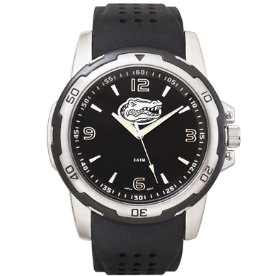 University of Florida Stealth watch for men has a brushed chrome finish alloy case with black and chrome molded bezel. Dial diameter 1 3/16in, case width 1 15/16in by 2 1/8in height. Case is 3 ATM water resistant with stainless steel back. Non-reflective coated mineral glass crystal to enhance dial visibility. Japanese quartz movement and 3 luminous hands. Black dial ring with contrasting white 60 minute number track. Glossy black dial with polished raised team logo and hour marks. Soft silicone rubber strap with stainless steel buckle. Lifetime limited warranty on watch. Comes in gift box packaging.