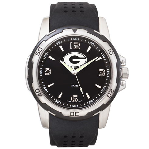 University of Georgia stealth sport watch has a brushed chrome finish alloy case with black and chrome molded bezel. Case is 3 ATM water resistant with stainless steel back. Dial diameter 1 3/16in, case width 1 15/16in by 2 1/8in height. Non-reflective coated mineral glass crystal to enhance dial visibility. Japanese quartz movement and 3 luminous hands. Black dial ring with contrasting white 60 minute number track. Glossy black dial with polished raised team logo and hour marks. Soft silicone rubber strap with stainless steel buckle. Lifetime limited warranty on watch. Comes in gift box packaging.