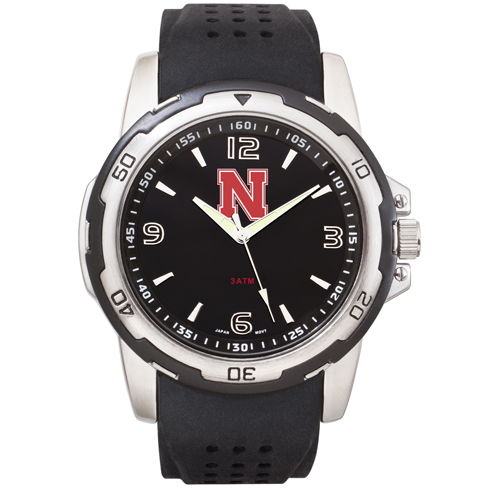 University of Nebraska stealth watch for men has a round dial and black rubber strap. Dial diameter 1 3/16in, case width 1 15/16in by 2 1/8in height. Brushed chrome finish alloy case with black and chrome molded bezel. Case is 3 ATM water resistant with stainless steel back. Non-reflective coated mineral glass crystal to enhance dial visibility. Japanese quartz movement and 3 luminous hands. Black dial ring with contrasting white 60 minute number track. Glossy black dial with polished raised team logo and hour marks. Soft silicone rubber strap with stainless steel buckle. Lifetime limited warranty on watch. Comes in gift box packaging.