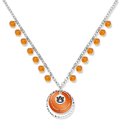 Your Auburn University outfit will be complete by wearing this Game Day necklace! This necklace boasts your school's color with 14 dangling orange glass beads on an 18in silver tone rolo chain. The pendant has multiple silver tone textured round metal circles that hang on top of a team-colored Lucite disk. To make the pendant complete, right in the middle of the action is a highly polished team logo charm deeply etched in bold black enamel. The chain features a secure lobster claw closure and has a three inch extender chain.