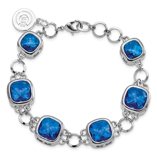 Provide encouragement for your 8in Chicago Cubs by wearing the Legend bracelet. Simply sophisticated in design, this silver tone bracelet features bezel-set team colored stones that are intricately cut in a checkerboard style. Four large square stones featured, two smaller stations complement either end and all are connected by round links. All the stones feature an open underside to radiate the light through the stones. Your team's accent charm is suspended at the end and a lobster claw closure secures it with ease.