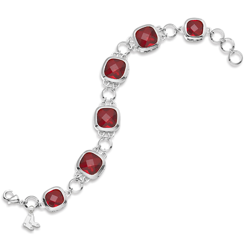 Show your love for the Boston Red Sox by wearing the Legend bracelet. This 8in silver tone bracelet features bezel-set team colored stones that are intricately cut in a checkerboard style. Four large square stones featured, two smaller stations complement either end and all are connected by round links. All the stones feature an open underside to radiate the light through the stones. Your team's accent charm is suspended at the end and a lobster claw closure secures it with ease.