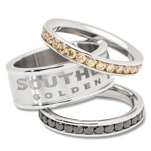 What better way to show off your eternal University of Southern Mississippi team loyalty than sporting these stacked crystal rings. This three-piece set includes a wide stainless steel center ring thats precisely etched with your team's name, while the two surrounding eternity rings feature faceted crystals in your team's primary and secondary colors. This set makes great fashion sense and great game-day attire! Offered in ladies sizes 6, 7, 8, and 9. Comes with leatherette pouch for protection.