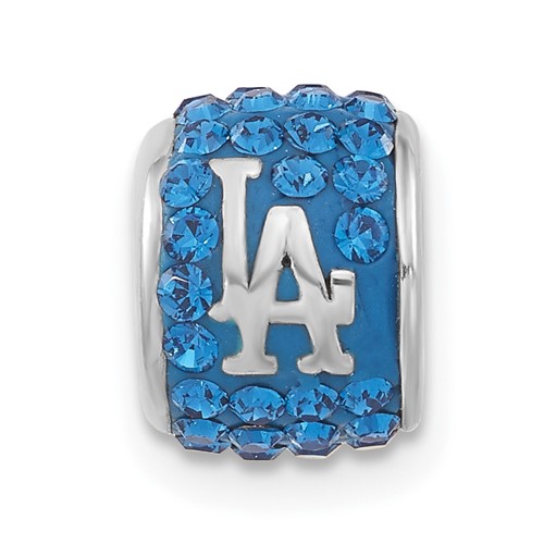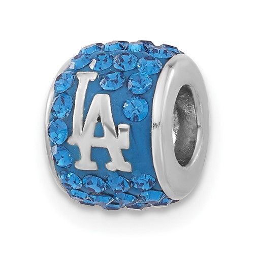 This barrel shaped Los Angeles Dodgers charm is crafted in sterling silver and is encrusted with blue crystals. On each side your team's logo is sculpted in raised relief and highly polished which provides a striking contrast against the sparkling crystals. Charm has 3/8in diameter with a 4mm opening. Packaged in black velvet presentation box. Available while supplies last.