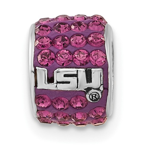 You will want to add this Louisiana State University charm to your collection of most cherished charms! This barrel shaped charm is crafted in the finest sterling silver and is encrusted with crystals that match your team's color. On each side your team's logo is sculpted in raised relief and highly polished which provides a striking contrast against the sparkling crystals. Charm has 3/8" diameter with a 4mm opening. Packaged in black velvet presentation box.