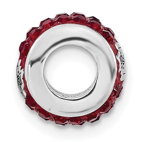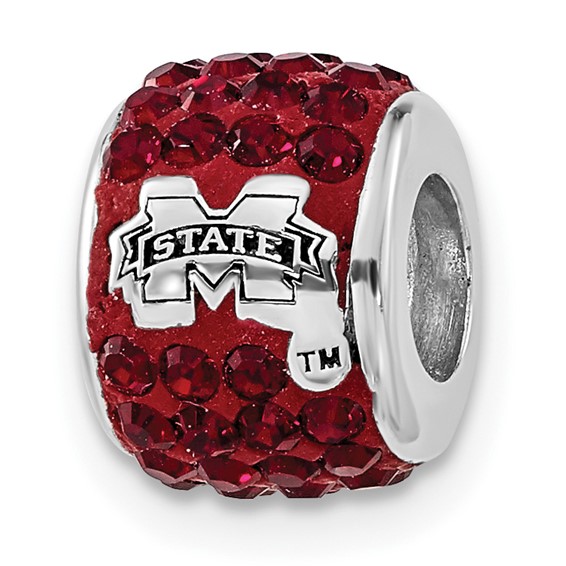 The Mississippi State University barrel shaped charm is crafted in the finest sterling silver and is encrusted with maroon crystals. On each side the school logo is sculpted in raised relief. Charm has 3/8in diameter with a 4mm opening. Packaged in black velvet presentation box.