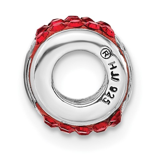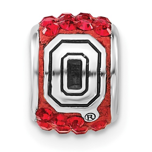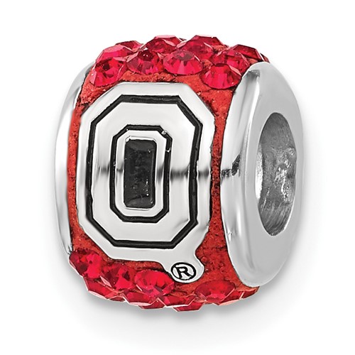 Ohio State University bead charm is crafted in the finest sterling silver and is encrusted with red crystals. On each side your team's logo is sculpted in raised relief and highly polished which provides a striking contrast against the sparkling crystals. Barrel shaped charm has 3/8in diameter with a 4mm opening. Packaged in black velvet presentation box.