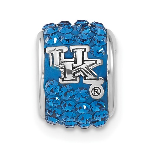 This barrel shaped University of Kentucky charm is crafted in sterling silver and is encrusted with blue crystals. On each side the UK logo is sculpted in raised relief and highly polished which provides a striking contrast against the sparkling crystals. Charm has 3/8in diameter with a 4mm opening. Fits all major modular bracelet brands. Officially licensed. Available while supplies last. Import.