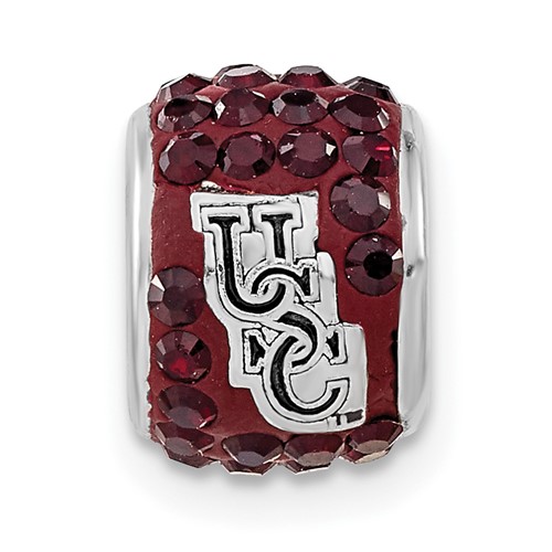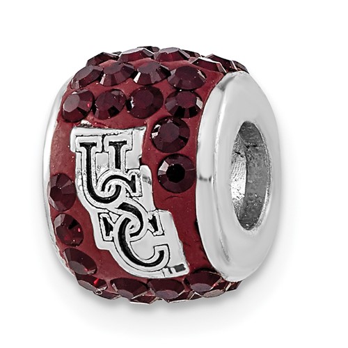 This barrel shaped University of South Carolina charm is crafted in the finest sterling silver and is encrusted with crystals that match your team's color. On each side your school's logo is sculpted in raised relief and highly polished which provides a striking contrast against the sparkling crystals. Charm has 3/8in diameter with a 4mm opening. Packaged in black velvet presentation box.