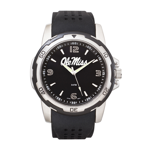 University of Mississippi Men's stealth sport watch has a brushed chrome finish alloy case with black and chrome molded bezel. Case is 3 ATM water resistant with stainless steel back. Non-reflective coated mineral glass crystal to enhance dial visibility. Japanese quartz movement and 3 luminous hands. Black dial ring with contrasting white 60 minute number track. Glossy black dial with polished raised team logo and hour marks. Soft silicone rubber strap with stainless steel buckle. Dial diameter 1 3/16in, case width 1 15/16in by 2 1/8in height. Lifetime limited warranty on watch. Comes in gift box packaging.