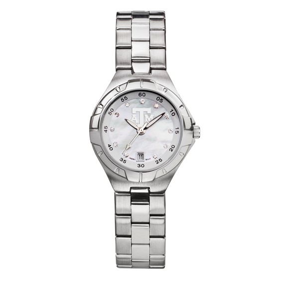 The ladies' Texas A&M mother of pearl watch has a polished chrome plated brass case with stainless steel back. Mother of pearl dial. Silver tone dial ring with printed minute track. Polished chiseled hour marks on silver tone dial. Miyota Japanese date movement (377 battery). Luminous hour and minute hands plus second hand. Stainless steel bracelet with push button clasp. Packaged in tin gift box. Lifetime limited warranty on watch.