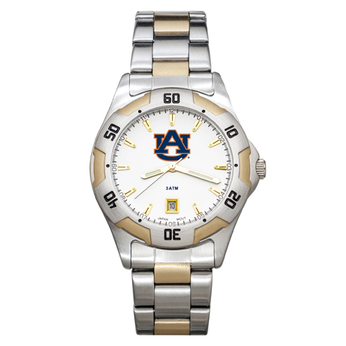 The men's Auburn University All-Pro watch has a 41mm brushed chrome-plated brass case with a rotating two-tone bezel. Two-tone brushed stainless steel link bracelet with push button buckle. It sports the AU emblem printed in color on a white dial which has raised gold-tone luminous hour markers, luminous hour, luminous minute and second hand, and date window at the 6 hour position. The water resistant case has a mineral glass crystal and a screw-down back. The watch features a precision Japanese quartz movement with a two year battery and lifetime limited warranty and it is packed in a tin gift box.
