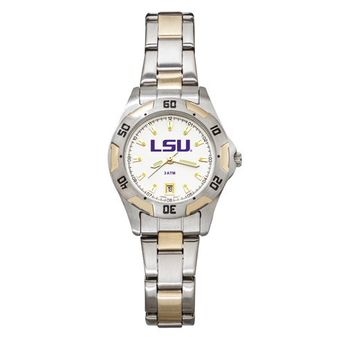 Women's All-Pro two-tone watch features a 28mm brushed chrome ionic plated brass case with a rotating two-tone bezel and two-tone brushed stainless steel link bracelet with push button buckle. It sports the team emblem printed in color on a white dial which has raised gold-tone luminous hour markers, luminous hour, luminous minute and second hand, and date window at the 6 hour position. The water resistant case has a mineral glass crystal and a screw-down back. The watch features a precision Japanese quartz movement with a two year battery and lifetime limited warranty and it is packed in a tin gift box.