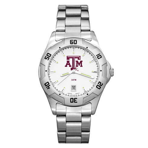 Texas A&M University men's all-pro chrome watch features a brushed chrome ionic plated brass case. Rotating bezel and two-tone brushed stainless steel link bracelet with push button buckle. It sports the Texas A&M University emblem printed in color on a white dial which has raised chrome luminous hour markers, luminous hour, luminous minute and second hand, and date window at the 6 hour position. The water resistant case has a mineral glass crystal and a screw-down back. The watch features a precision Japanese quartz movement with a two year battery and lifetime limited warranty and it is packed in a tin gift box.