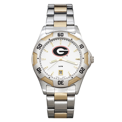 University of Georgia men's All-Pro watch features a brushed chrome ionic plated brass case with a rotating two-tone bezel. Two-tone brushed stainless steel link bracelet with push button buckle. It sports the University of Georgia emblem printed in color on a white dial which has raised gold-tone luminous hour markers, luminous hour, luminous minute and second hand, and date window at the 6 hour position. The water resistant case has a mineral glass crystal and a screw-down back. The watch features a precision Japanese quartz movement with a two year battery and lifetime limited warranty and it is packed in a tin gift box.