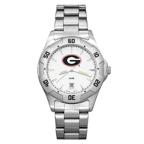 University of Georgia men's All-Pro watch features a brushed chrome ionic plated brass case with a rotating bezel. Brushed stainless steel link bracelet with push button buckle. Case size: 41.3mm. It sports the University of Georgia emblem printed in color on a white dial which has raised chrome luminous hour markers, luminous hour, luminous minute and second hand, and date window at the 6 hour position. The water resistant case has a mineral glass crystal and a screw-down back. The watch features a precision Japanese quartz movement with a two year battery and lifetime limited warranty and it is packed in a tin gift box.