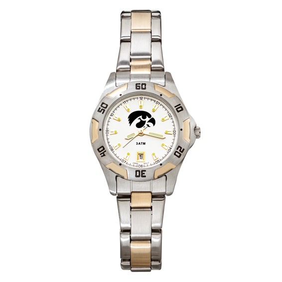 Women's University of Iowa All-Pro watch has a two-tone brushed chrome ionic plated brass case with a rotating bezel. Two-tone brushed stainless steel link bracelet with push button buckle. It sports the University of Iowa emblem printed in color on a white dial which has raised gold-tone luminous hour markers, luminous hour, luminous minute and second hand, and date window at the 6 hour position. The water resistant case has a mineral glass crystal and a screw-down back. The watch features a precision Japanese quartz movement with a two year battery and lifetime limited warranty and it is packed in a tin gift box.