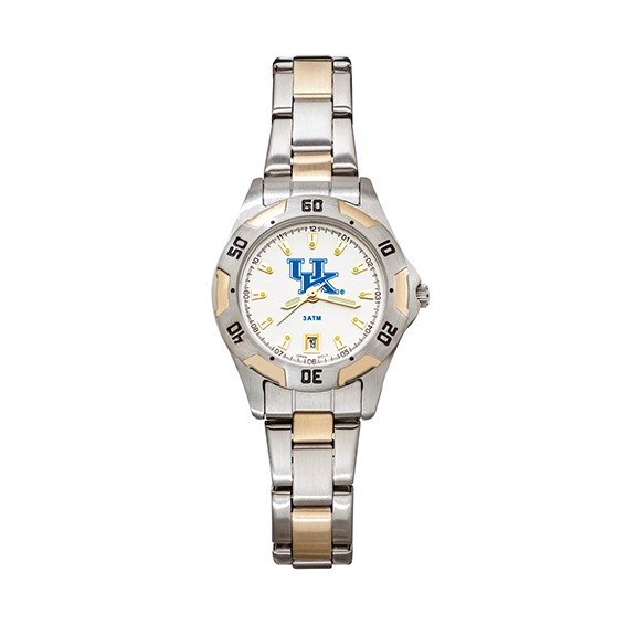This ladies' University of Kentucky All-Pro watch features a two-tone brushed chrome ionic plated brass case with a rotating bezel. Round white dial features the UK logo in blue. Two-tone brushed stainless steel link bracelet with push button buckle. Dial has raised gold-tone luminous hour markers, luminous hour, luminous minute and second hand, and date window at the 6 hour position. The water resistant case has a mineral glass crystal and a screw-down back. The watch features a precision Japanese quartz movement with a two year battery and lifetime limited warranty and it is packed in a tin gift box.