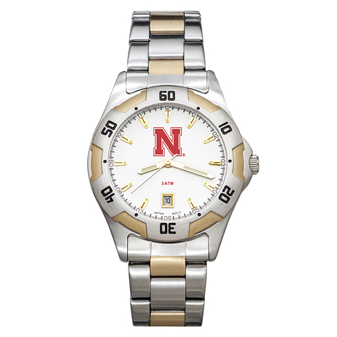 University of Nebraska men's all-pro two-tone watch features a brushed chrome ionic plated brass case with a rotating two-tone bezel. Two-tone brushed stainless steel link bracelet with push button buckle. It sports the University of Nebraska emblem printed in color on a white dial which has raised gold-tone luminous hour markers, luminous hour, luminous minute and second hand, and date window at the 6 hour position. The water resistant case has a mineral glass crystal and a screw-down back. The watch features a precision Japanese quartz movement with a two year battery and lifetime limited warranty and it is packed in a tin gift box.