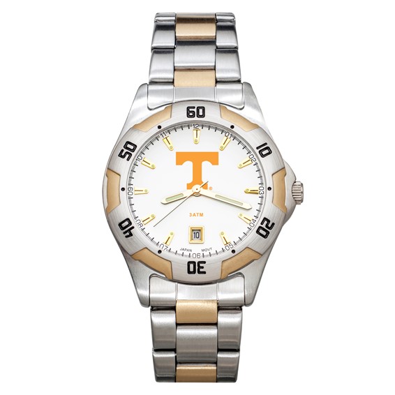 University of Tennessee men's All-Pro two-tone watch features a brushed chrome ionic plated 41mm brass case with a rotating two-tone bezel. Two-tone brushed stainless steel link bracelet and push button buckle. It sports the University of Tennessee emblem printed in color on a white dial which has raised gold-tone luminous hour markers, luminous hour, luminous minute and second hand, and date window at the 6 hour position. The water resistant case has a mineral glass crystal and a screw-down back. The watch features a precision Japanese quartz movement with a two year battery and lifetime limited warranty and it is packed in a tin gift box.