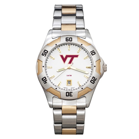 Virginia Tech men's all-pro two-tone watch features a brushed chrome ionic plated brass case with a rotating two-tone bezel. Two-tone brushed stainless steel link bracelet with push button buckle. It sports the Virginia Tech emblem printed in color on a white dial which has raised gold-tone luminous hour markers, luminous hour, luminous minute and second hand, and date window at the 6 hour position. The water resistant case has a mineral glass crystal and a screw-down back. The watch features a precision Japanese quartz movement with a two year battery and lifetime limited warranty and it is packed in a tin gift box.