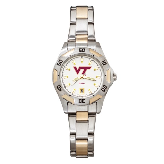 Virginia Tech women's All-Pro two-tone watch features a brushed chrome ionic plated brass case with a rotating two-tone bezel. Two-tone brushed stainless steel link bracelet with push button buckle. It sports the Virginia Tech emblem printed in color on a white dial which has raised gold-tone luminous hour markers, luminous hour, luminous minute and second hand, and date window at the 6 hour position. The water resistant case has a mineral glass crystal and a screw-down back. The watch features a precision Japanese quartz movement with a two year battery and lifetime limited warranty and it is packed in a tin gift box.