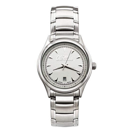 Ole Miss men's classic watch has a polished chrome plated brass case with stainless steel back. Silver tone dial ring with printed minute track. Polished chiseled hour marks on silver tone dial. Case is 1 1/2 inches wide by 1 3/4 inches tall. Dial diameter 1 1/8 inches. Bracelet is 8 3/4 inches long. Miyota Japanese date movement (377 battery). Luminous hour and minute hands plus second hand. Stainless steel bracelet with push button clasp. Packaged in tin gift box. Lifetime limited warranty on watch.