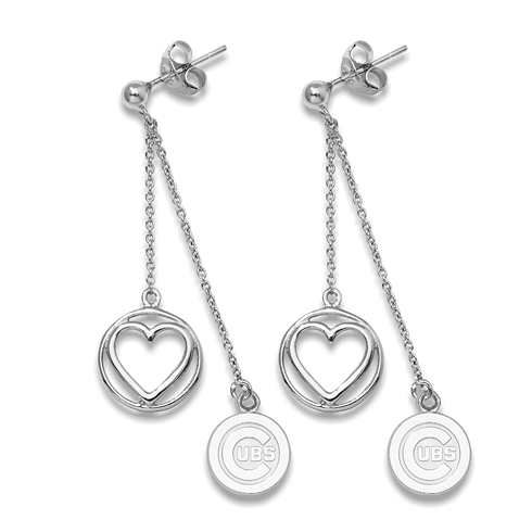 You love your Chicago Cubs with all of your heart and what better way to display your affection than by wearing these Beloved earrings. These sterling silver earrings combine an open-work heart-in-circle design which swings freely alongside your favorite team's charm, each dangling sweetly on delicate strands of silver chain. These ball post earrings with push back closures are lovingly crafted, uniquely designed and the ultimate symbol of team love.