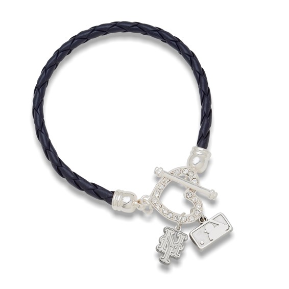 Keep your New York Mets close at hand with this Devotion bracelet! At home, work, or at the game, show your team pride with this bracelet! This 7.5 inch pretty braided bracelet is made with faux leather for long lasting wear in your team's specific color. The sparkling heart-toggle closure symbolizes your love for the team and is a quick and convenient way to attach to your wrist securely. It is decorated with 2 highly polished silver toned charms; your team charm and the official MLB Batterman charm. This bracelet perfectly pulls together your game day look. Can be worn alone or for a trendy chic look can be layered with other chains and bangles.