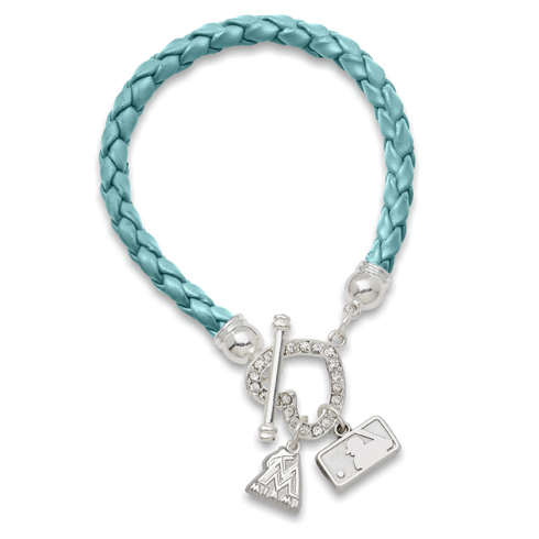 Keep your Miami Marlins close at hand with this Devotion bracelet! At home, work, or at the game, show your team pride with this bracelet! This 7.5 inch pretty braided bracelet is made with faux leather for long lasting wear in your team's specific color. The sparkling heart-toggle closure symbolizes your love for the team and is a quick and convenient way to attach to your wrist securely. It is decorated with 2 highly polished silver toned charms; your team charm and the official MLB Batterman charm. This bracelet perfectly pulls together your game day look. Can be worn alone or for a trendy chic look can be layered with other chains and bangles.
