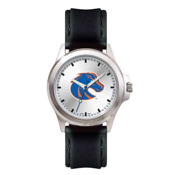 This Boise State Fantom watch case 1 5/8in wide by 1 3/4in tall, dial diameter 1 1/16in. Men's water resistant sport watch. Sunray silver tone dial ring with notched silver tone dimensional dial ring. Luminous hour and minute hands with second hand in team color. Brushed chrome finish alloy case and stainless steel back. Soft padded stitched edge leather strap with stainless steel buckle. Japanese quartz movement. Packaged in rectangular tin gift box. Limited lifetime warranty.