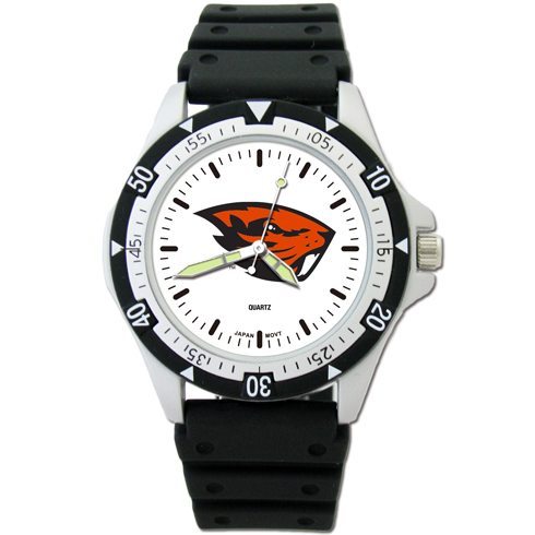 This Oregon State University Option Sport watch case is 1 1/2in wide, dial diameter 1in. Strap is 8 inches long. Water resistant man's sport watch. Black ABS plastic resin case and stainless steel snap back. Rotating ABS bezel and acrylic crystal. Black PU rubber strap with stainless steel buckle. Japanese quartz movement. Stainless steel crown, luminous hands. Packaged in square tin gift box or flat hanging blister pack. Limited lifetime warranty on watch.