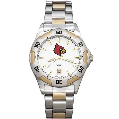 This University of Louisville men's All-Pro two-tone watch features a brushed chrome ionic plated brass case with a rotating two-tone bezel and two-tone brushed stainless steel link bracelet with push button buckle. It sports the team emblem printed in color on a white dial which has raised gold-tone luminous hour markers, luminous hour, luminous minute and second hand, and date window at the 6 hour position. The water resistant case has a mineral glass crystal and a screw-down back. The watch features a precision Japanese quartz movement with a two year battery and lifetime limited warranty and it is packed in a tin gift box.