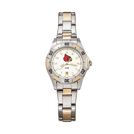 University of Louisville Women's All-Pro two-tone watch features a brushed chrome ionic plated brass case with a rotating two-tone bezel and two-tone brushed stainless steel link bracelet with push button buckle. It sports the team emblem printed in color on a white dial which has raised gold-tone luminous hour markers, luminous hour, luminous minute and second hand, and date window at the 6 hour position. The water resistant case has a mineral glass crystal and a screw-down back. The watch features a precision Japanese quartz movement with a two year battery and lifetime limited warranty and it is packed in a tin gift box.