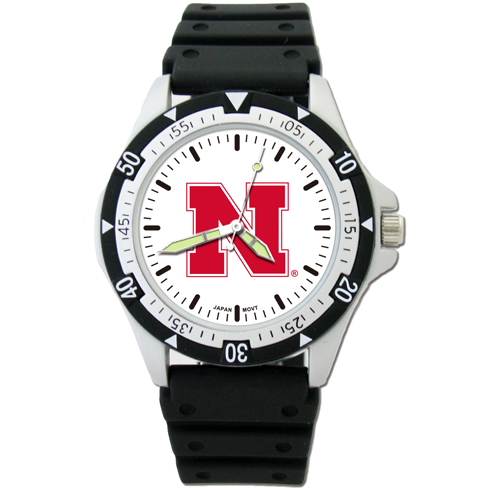 This University of Nebraska Option Sport watch has a round white dial and black rubber strap. Plastic resin case and rotating bezel. Case is 1 1/2in wide, dial diameter 1in. Strap is 8 inches long. Water resistant man's sport watch. Black ABS plastic resin case and stainless steel snap back. Rotating ABS bezel and acrylic crystal. Black PU rubber strap with stainless steel buckle. Japanese quartz movement. Stainless steel crown, luminous hands. Packaged in square tin gift box or flat hanging blister pack. Limited lifetime warranty on watch.