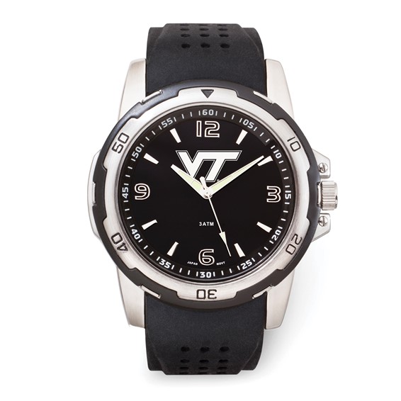 This Virginia Tech University stealth men's sport watch has a brushed chrome finish alloy case with black and chrome molded bezel. Dial diameter 1 3/16in, case width 1 15/16in by 2 1/8in height. BCase is 3 ATM water resistant with stainless steel back. Non-reflective coated mineral glass crystal to enhance dial visibility. Japanese quartz movement (#377 battery) and 3 luminous hands. Black dial ring with contrasting white 60 minute number track. Glossy black dial with polished raised team logo and hour marks. Soft silicone rubber strap with stainless steel buckle.