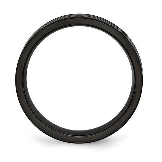 Black-plated titanium ring has a brushed center with polished grooves. Width: 6mm. Comfort fit ring is made of commercially pure titanium, grade 4 [CP 4]. Imported. This style is available in half and whole finger sizes, 6-13.