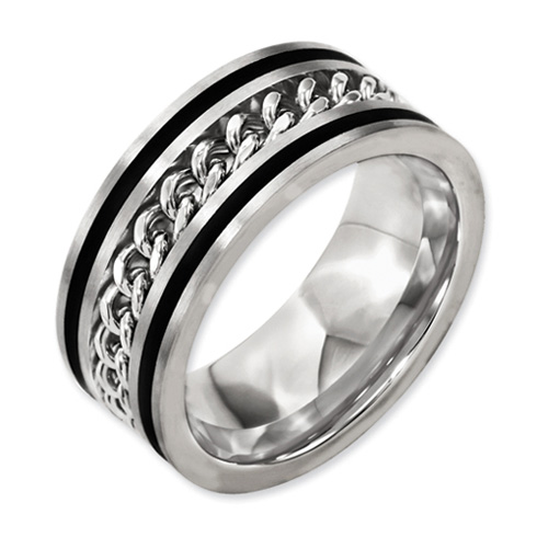 Titanium ring with a brushed and polished finish. Black IP-plated design. Width: 10mm. Comfort fit ring is made of commercially pure titanium, grade 4 [CP 4]. Imported. This style is available in half and whole finger sizes, 8-14. Approximate weight: 10.52 grams.