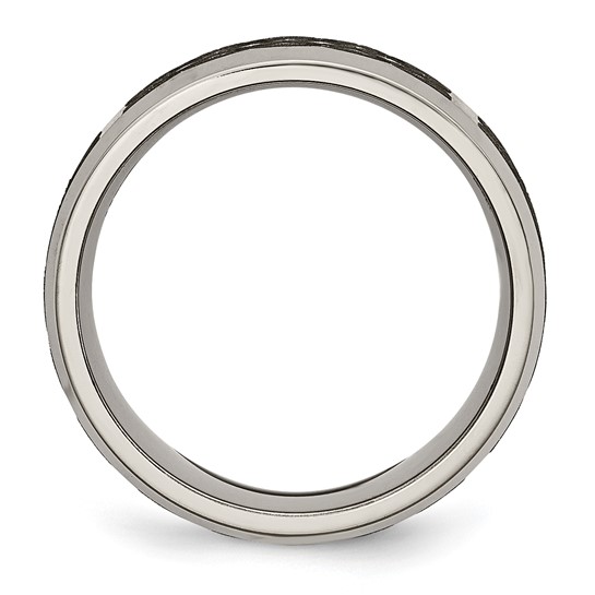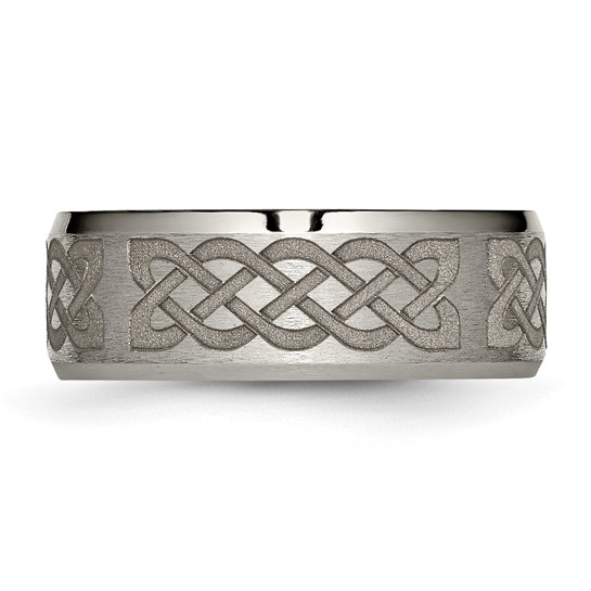 Beveled edge titanium ring with a brushed and polished finish. Laser engraved weave design. Width: 8mm. Comfort fit. Ring is made of commercially pure titanium, grade 4 [CP 4]. Imported. This style is available in half and whole finger sizes, 7-13.