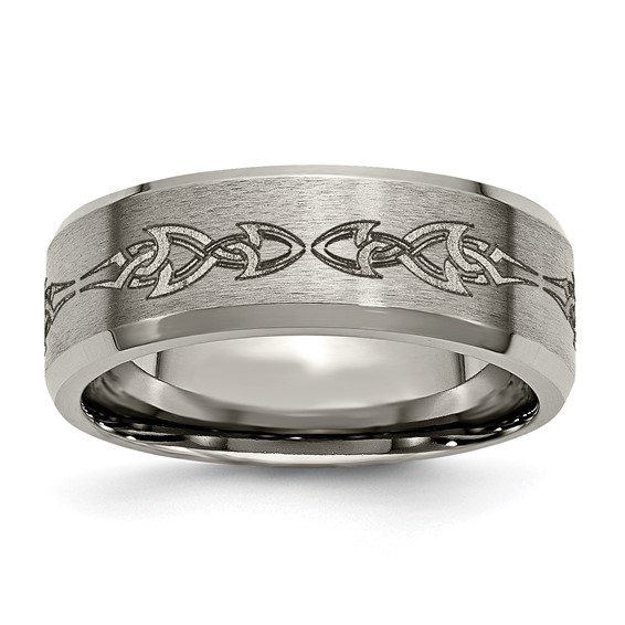 Beveled edge titanium ring with a brushed and polished finish. Laser engraved pinstripe design. Width: 8mm. Comfort fit ring is made of commercially pure titanium, grade 4 [CP 4]. Imported. This style is available in half and whole finger sizes, 7-13.