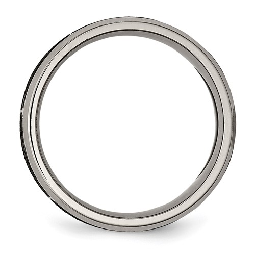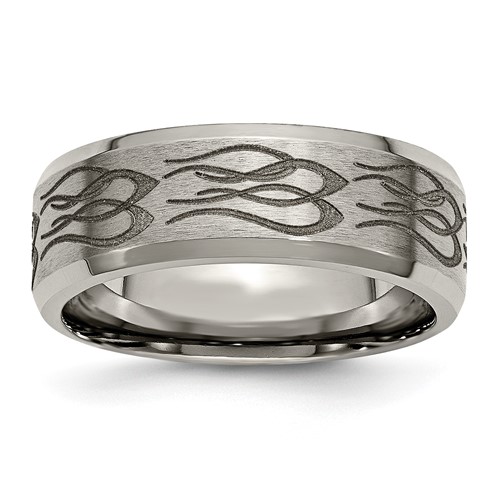Beveled edge titanium ring has a laser engraved flame design. Brushed and polished finish. Width: 8mm. Comfort fit ring is made of commercially pure titanium, grade 4 [CP 4]. Imported. This style is available in half and whole finger sizes, 7-13.