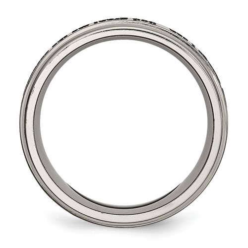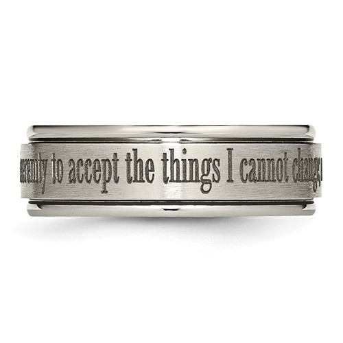 Ridged edge titanium ring with a brushed and polished finish. Serenity prayer is laser engraved. Width: 8mm. Comfort fit ring is made of commercially pure titanium, grade 4 [CP 4]. Imported. This style is available in half and whole finger sizes, 7-13. Serenity Prayer: God grant me the serenity to accept the things I cannot change; courage to change the things I can.