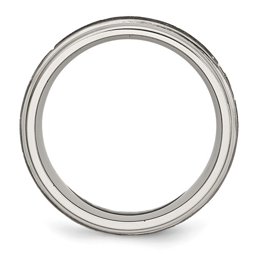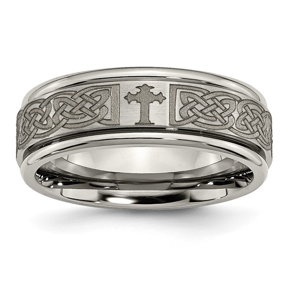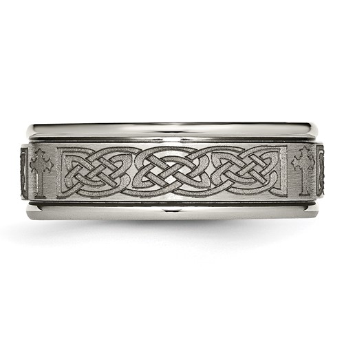 Ridged edge titanium ring has a Celtic design and crosses laser engraved. Brushed and polished finish. Width: 8mm. Comfort fit ring is made of commercially pure titanium, grade 4 [CP 4]. Imported. This style is available in half and whole finger sizes, 7-13.