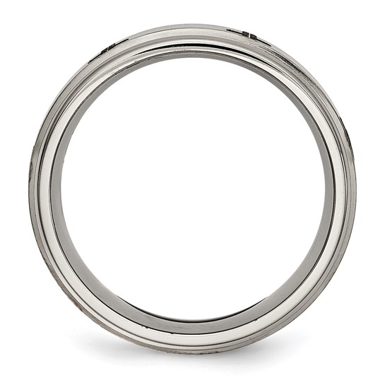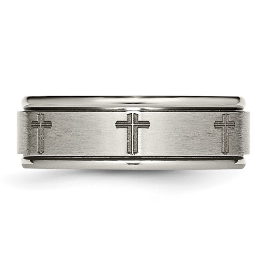 Ridged edge titanium ring has a laser engraved crosses design. Brushed and polished finish. Width: 8mm. Comfort fit ring is made of commercially pure titanium, grade 4 [CP 4]. Imported. This style is available in half and whole finger sizes, 7-13.