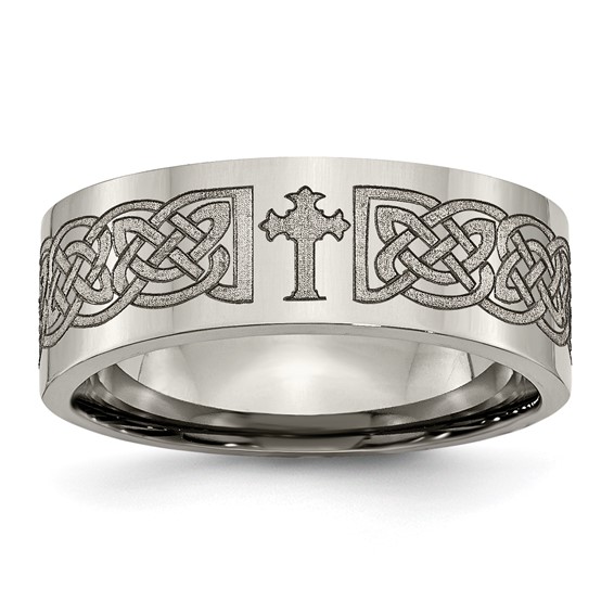 Flat titanium ring has a polished finish and laser engraved Celtic cross design. Width: 8mm. Comfort fit ring is made of commercially pure titanium, grade 4 [CP 4]. Imported. This style is available in half and whole finger sizes, 7-13.