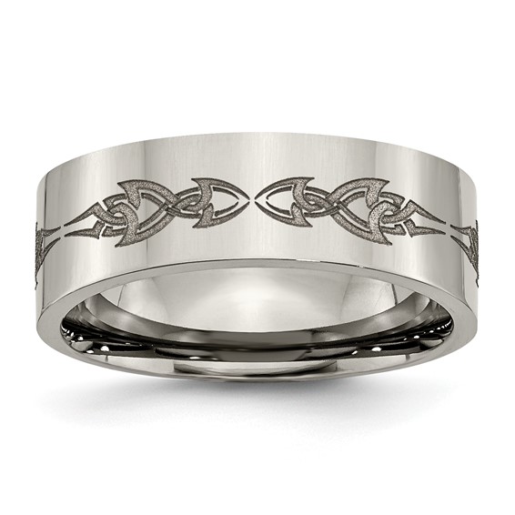 Flat titanium ring boasts a laser engraved pinstripe design. Polished finish. Width: 8mm. Comfort fit ring is made of commercially pure titanium, grade 4 [CP 4]. Imported. This style is available in half and whole finger sizes, 7-13.