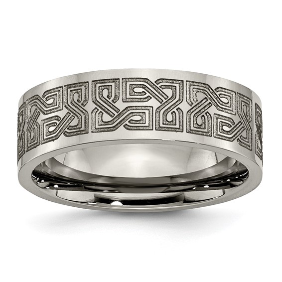 This wide flat titanium ring has a fancy weave design. Laser engraved design and polished finish. Width: 8mm. Comfort fit ring is made of commercially pure titanium, grade 4 [CP 4]. Imported. This style is available in half and whole finger sizes, 7-13.