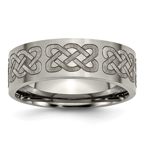 Flat titanium ring has a laser engraved weave design and brushed finish. Width: 8mm. Comfort fit ring is made of commercially pure titanium, grade 4 [CP 4]. Imported. This style is available in half and whole finger sizes, 7-13.