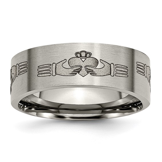 Flat brushed titanium ring has a claddagh laser engraved design. Width: 8mm. Comfort fit ring is made of commercially pure titanium, grade 4 [CP 4]. Imported. This style is available in half and whole finger sizes, 7-13.