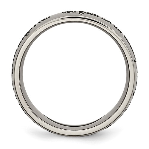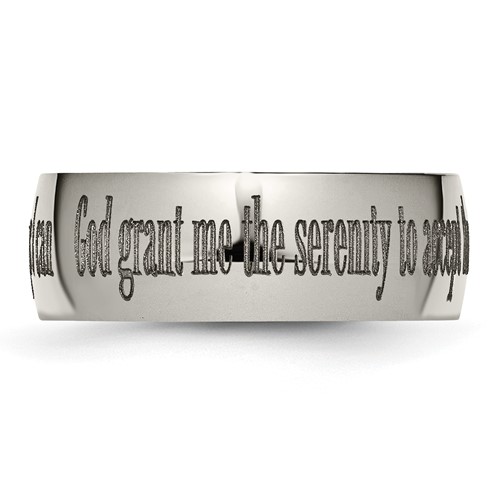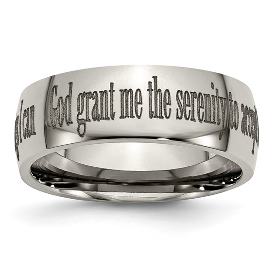 Domed titanium ring has a polished finish. Serenity prayer is laser engraved aroud the ring. Width: 8mm. Comfort fit ring is made of commercially pure titanium, grade 4 [CP 4]. Imported. This style is available in half and whole finger sizes, 7-13. Serenity Prayer: God grant me the serenity to accept the things I cannot change; courage to change the things I can.
